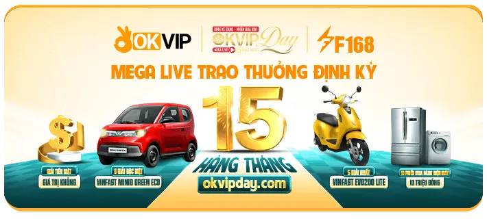 Tham gia sự kiện OKVIP Day cùng F168 để có cơ hội trúng xe hơi, xe máy và hàng loạt phần quà giá trị. Chỉ cần online và dự đoán may mắn trong livestream, bạn có thể trở thành chủ nhân giải thưởng hấp dẫn mỗi tháng!